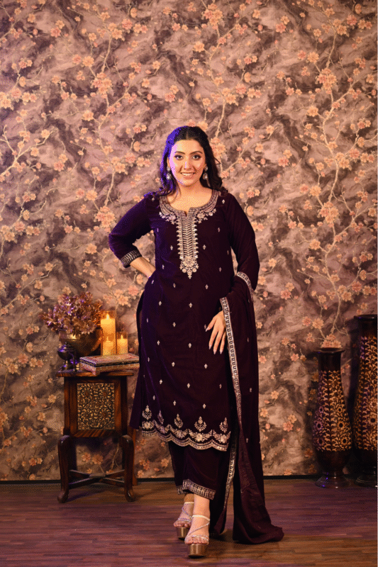 Shripali Wine Velvet 3Pc Kurta Set With Hand Embroidery Zari And Sequins Work