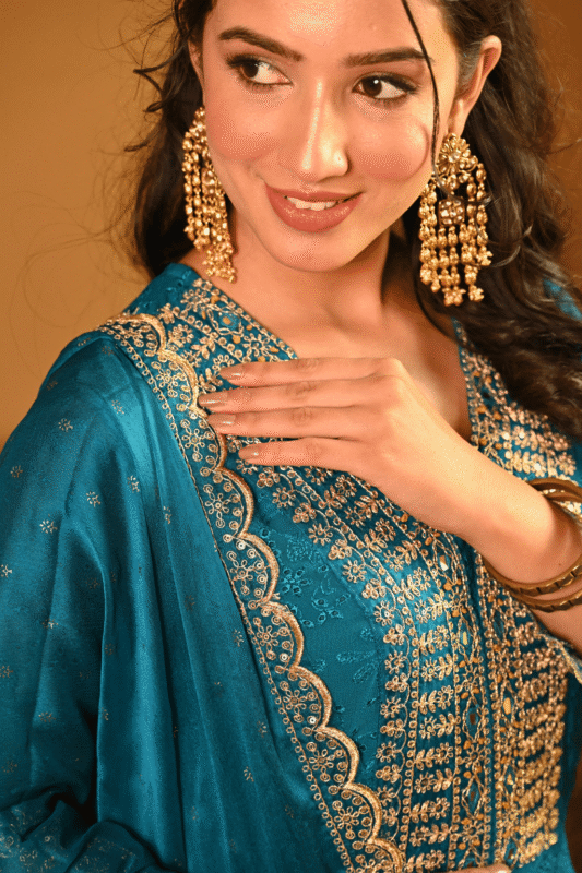 Shripali Rama Teal Anarkali 3 Pc Suit With Zari And Sequins Embroidery