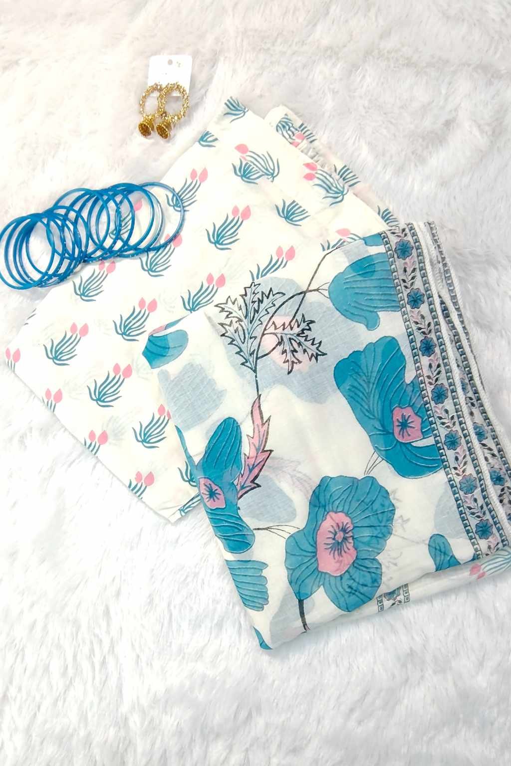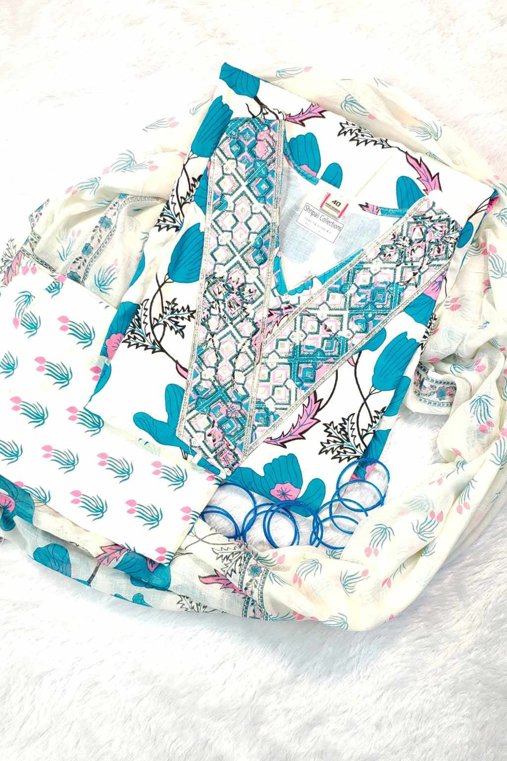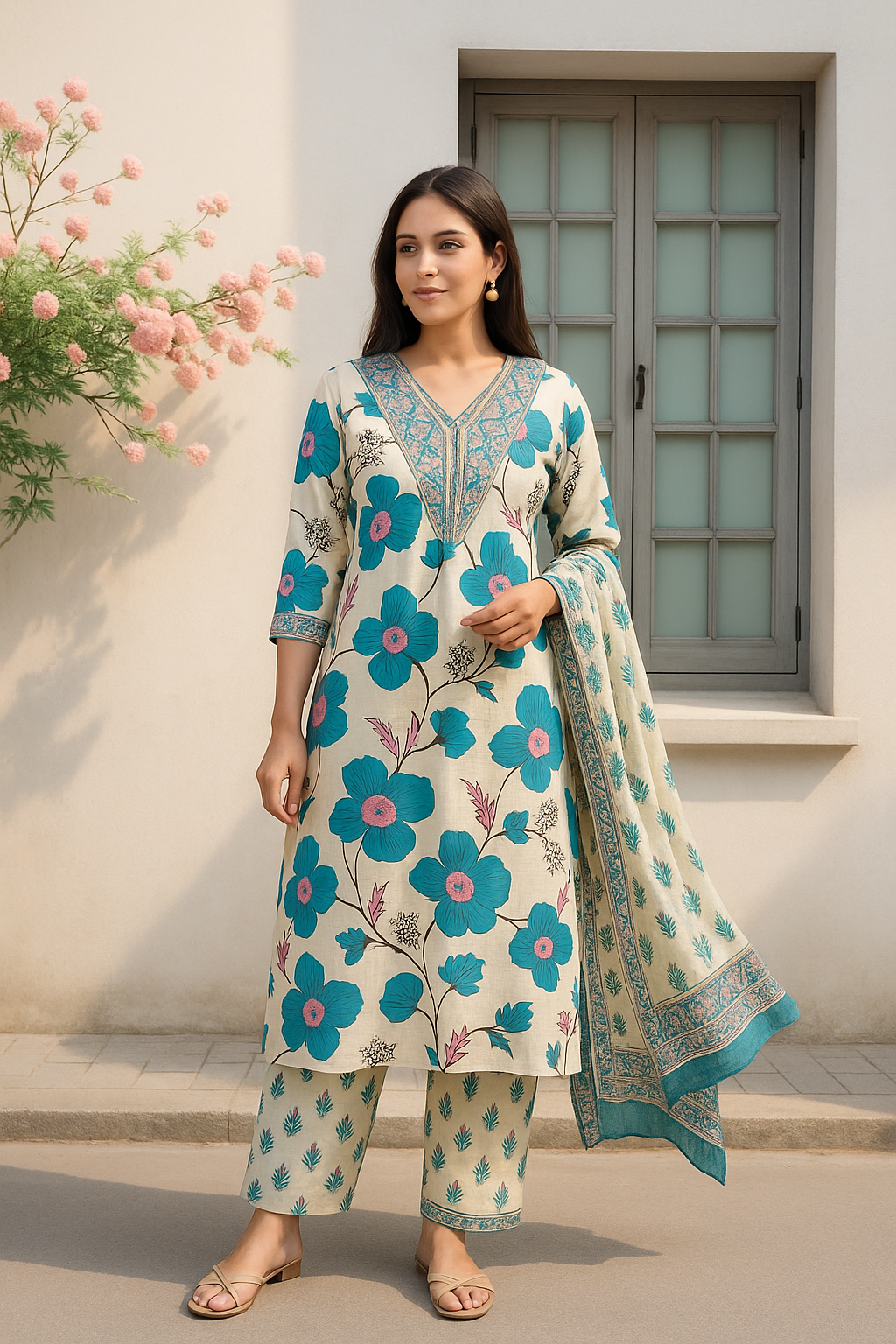 Bring a refreshing burst of color to your wardrobe with this Pure Cotton A-Line Suit Set, crafted for all-day comfort and effortless style. The ivory kurta is beautifully adorned with turquoise blue and pink floral prints in a screen/block-inspired design, creating a vibrant yet graceful look.