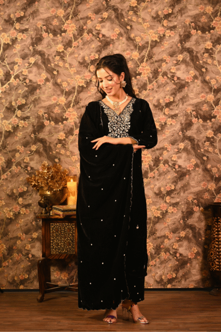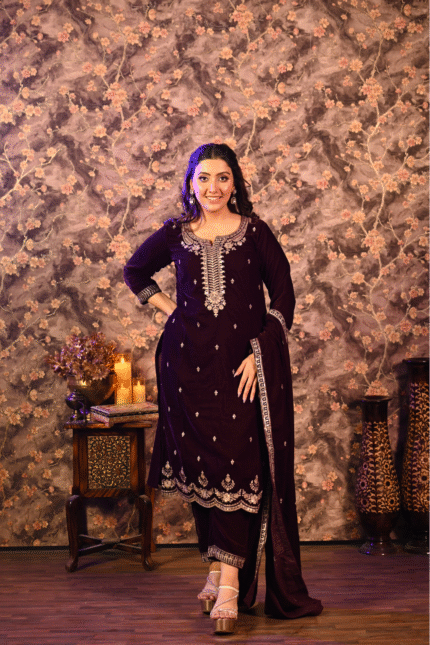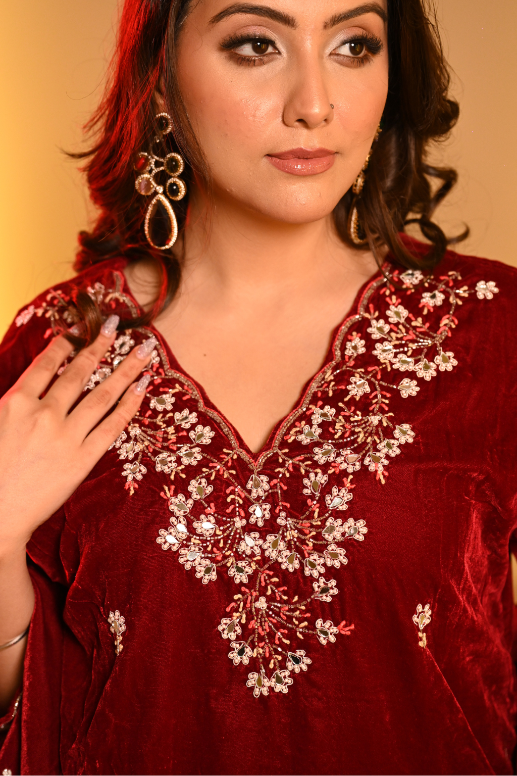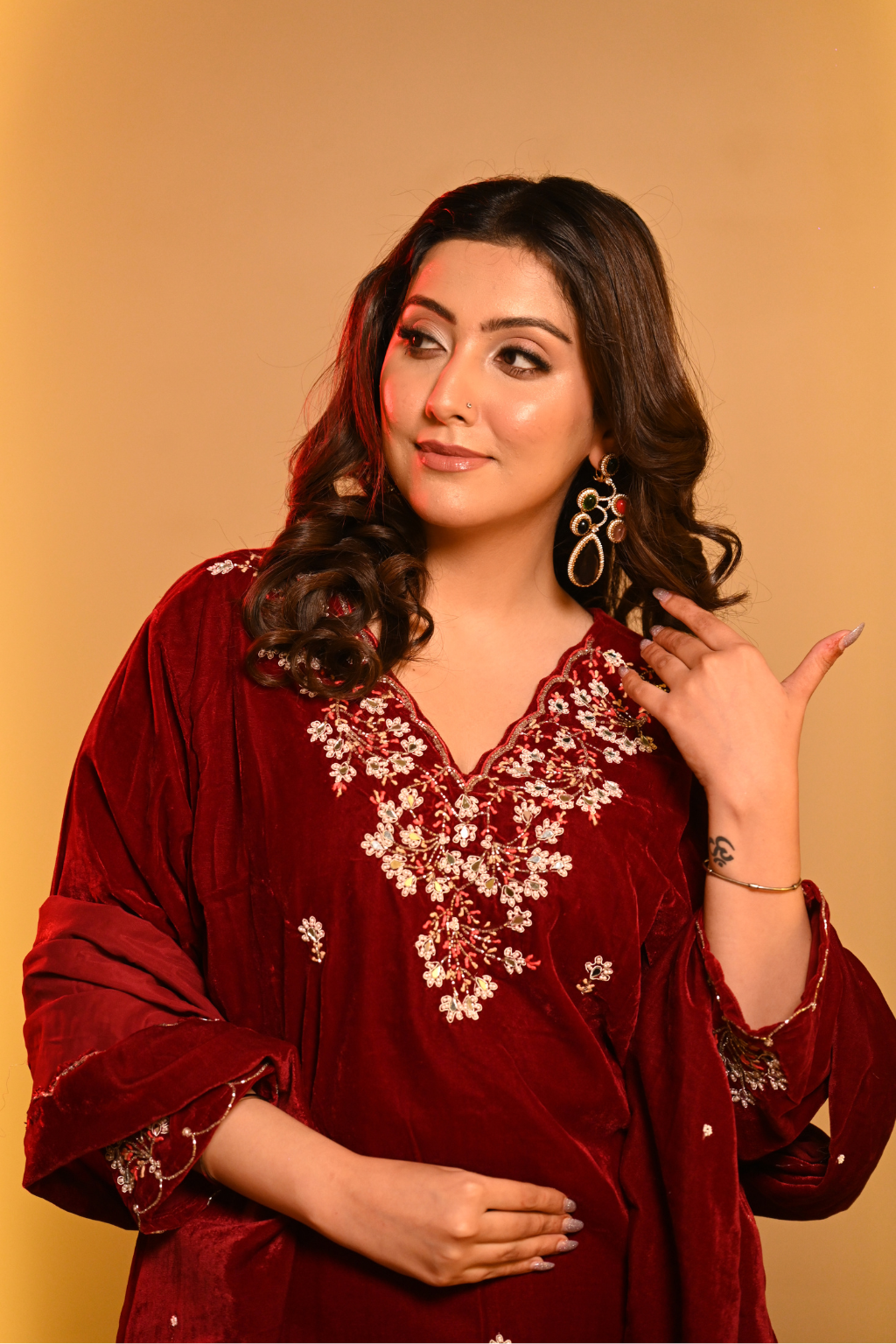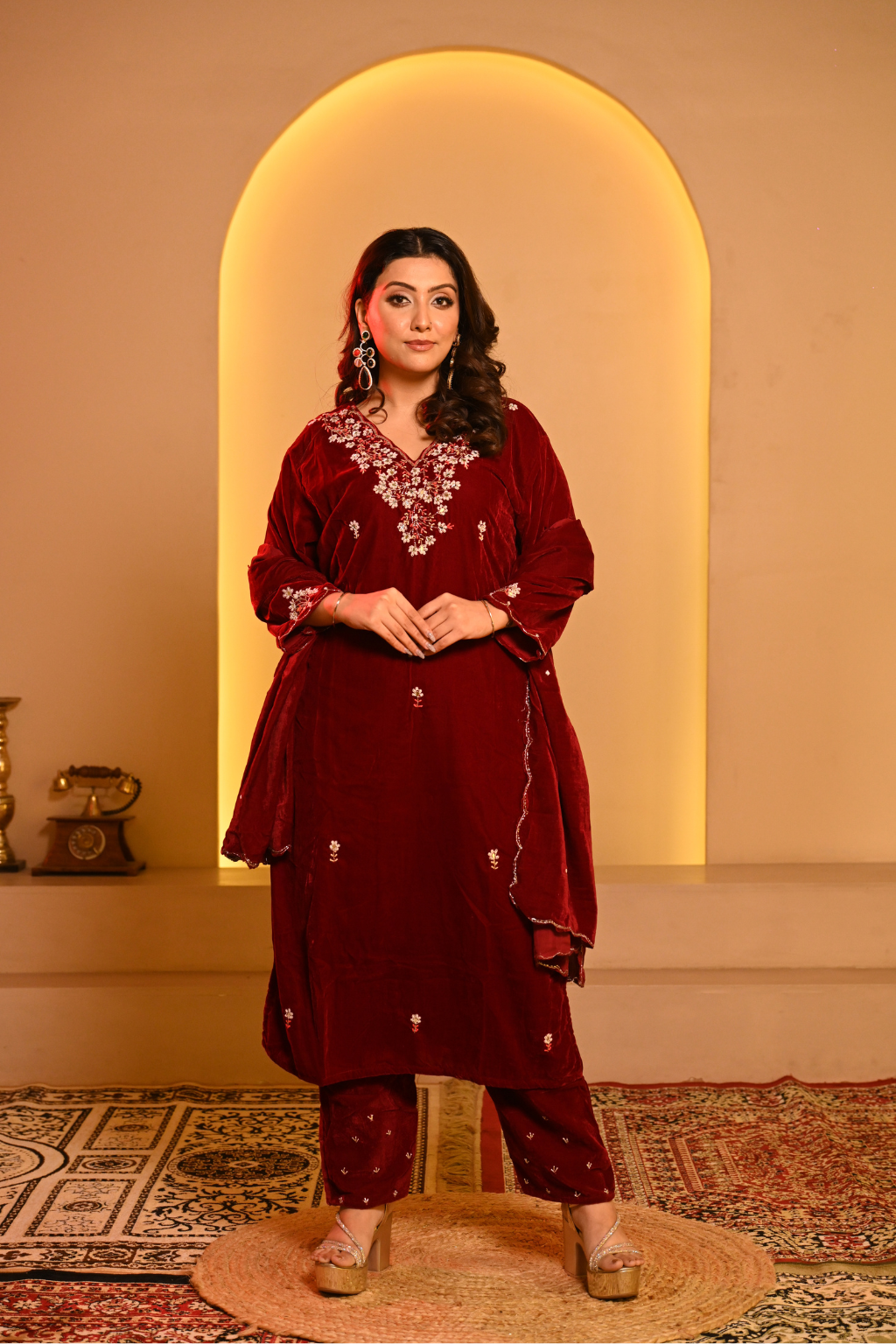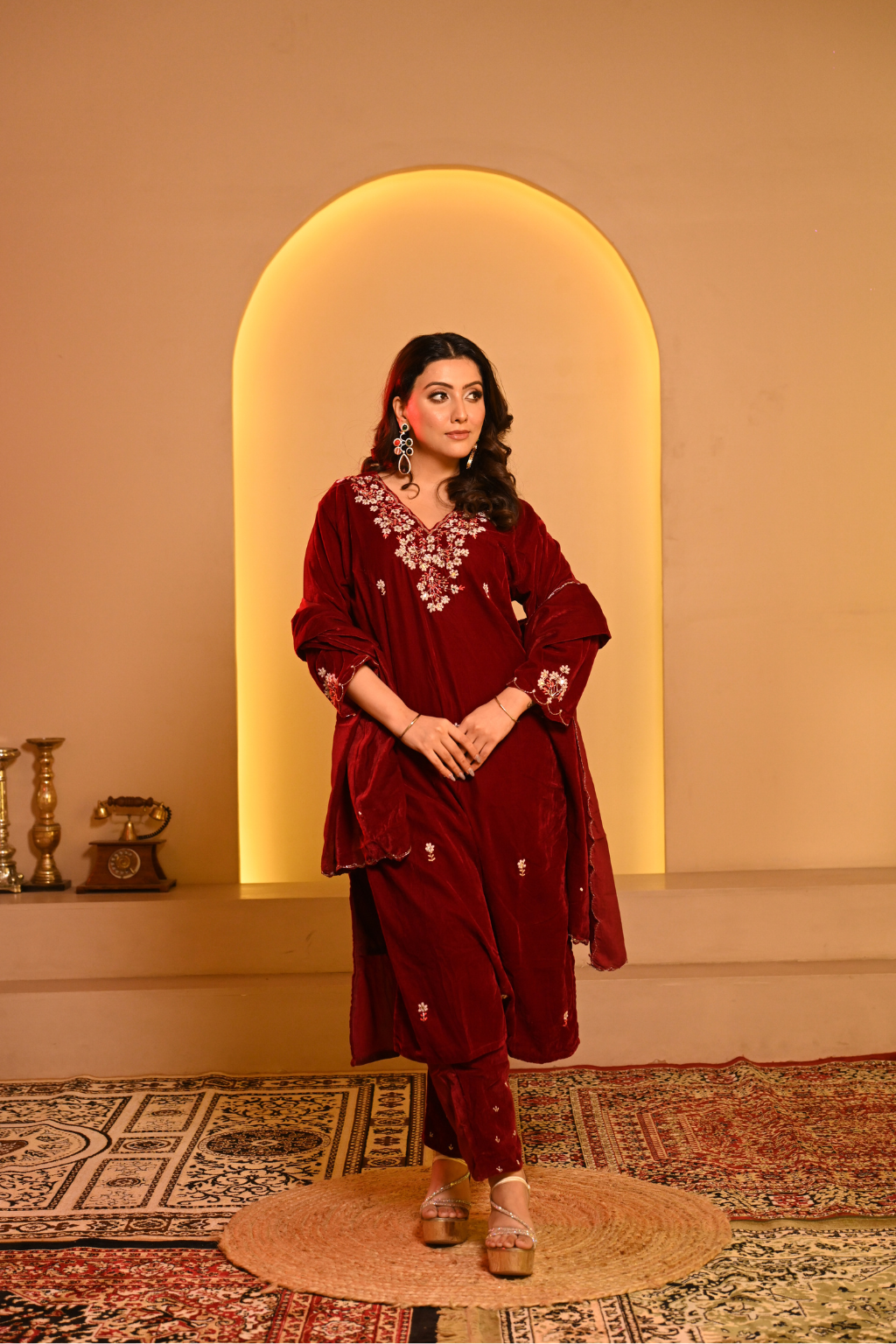 “A statement of graceful luxury — this Velvet Rouge Suit Set is crafted in rich, soft velvet and adorned with intricate hand-embroidered floral motifs in tone-on-tone thread, zari and beadwork. The refined neckline and sleeve detailing give it a designer finish, making it a perfect pick for festive evenings, winter weddings, and intimate celebrations.