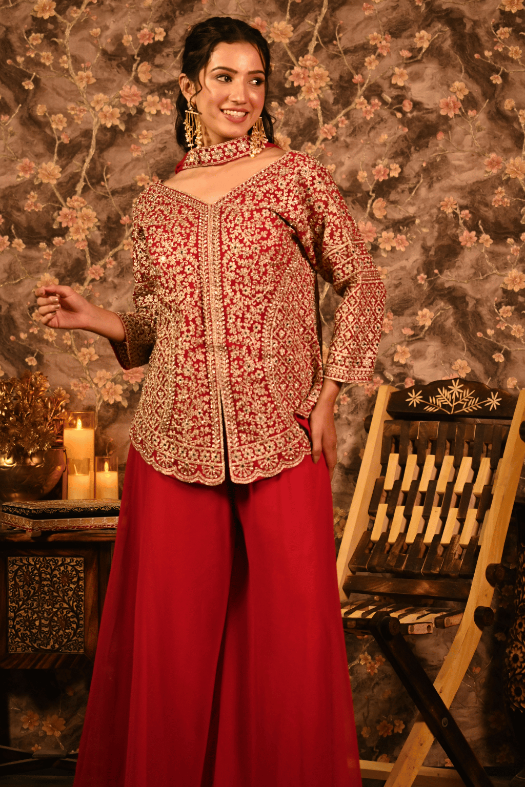 “Exude timeless allure in our shripali designer royal empress Enchant Hand-Embroidered Sharara Set, a masterpiece that embodies royal sophistication and festive charm. The rich crimson hue paired with intricate mirror and zari embroidery creates a look that’s both traditional and glamorous.