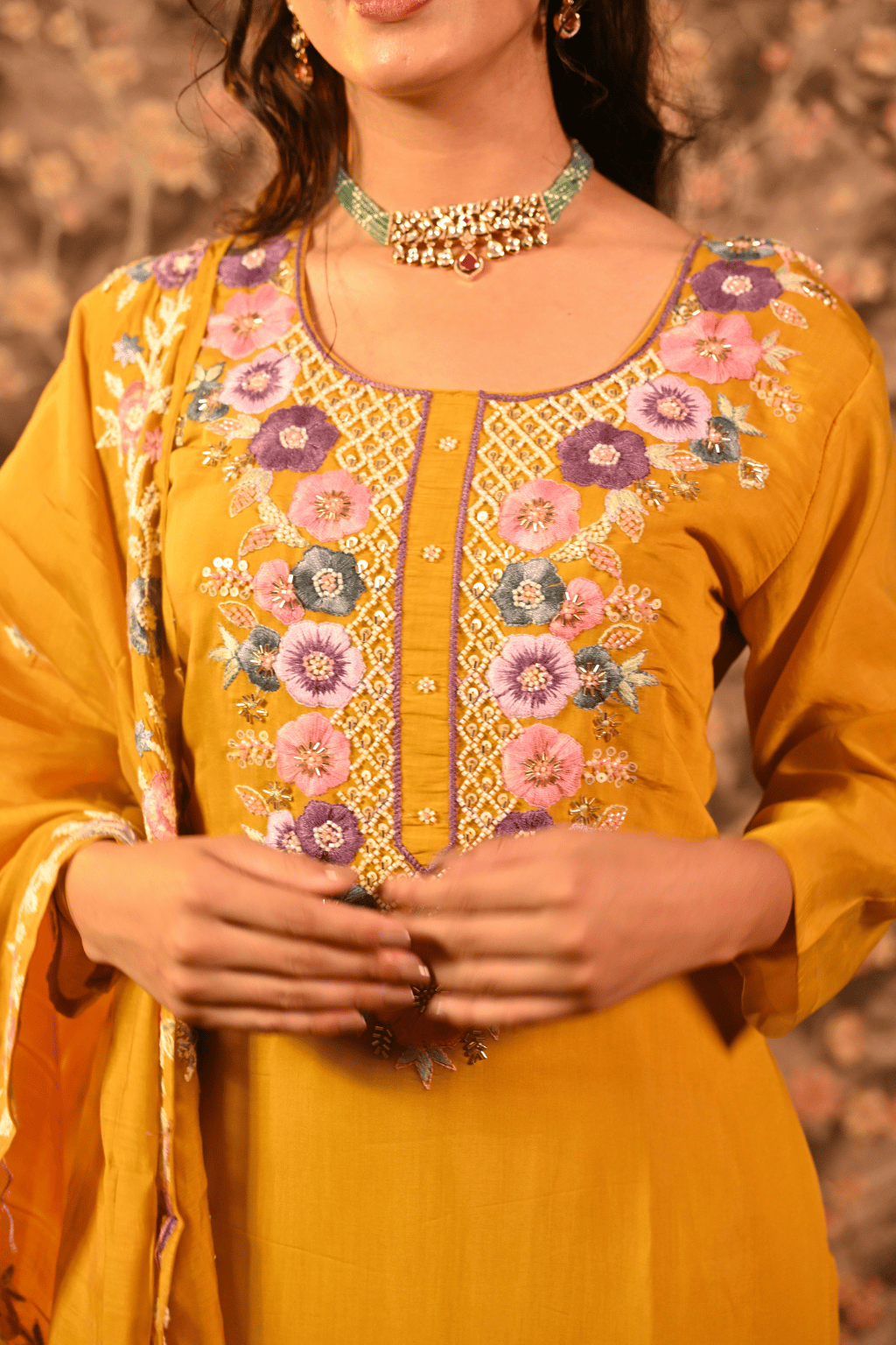 Radiate sunshine and sophistication with our Haldi Glam Embroidered Suit Set, a perfect blend of grace and vibrance. Crafted from soft georgette fabric, this beautiful mustard ensemble features intricate multicolor thread embroidery along the neckline, sleeves, and dupatta borders — creating a blooming floral charm that’s ideal for festive occasions