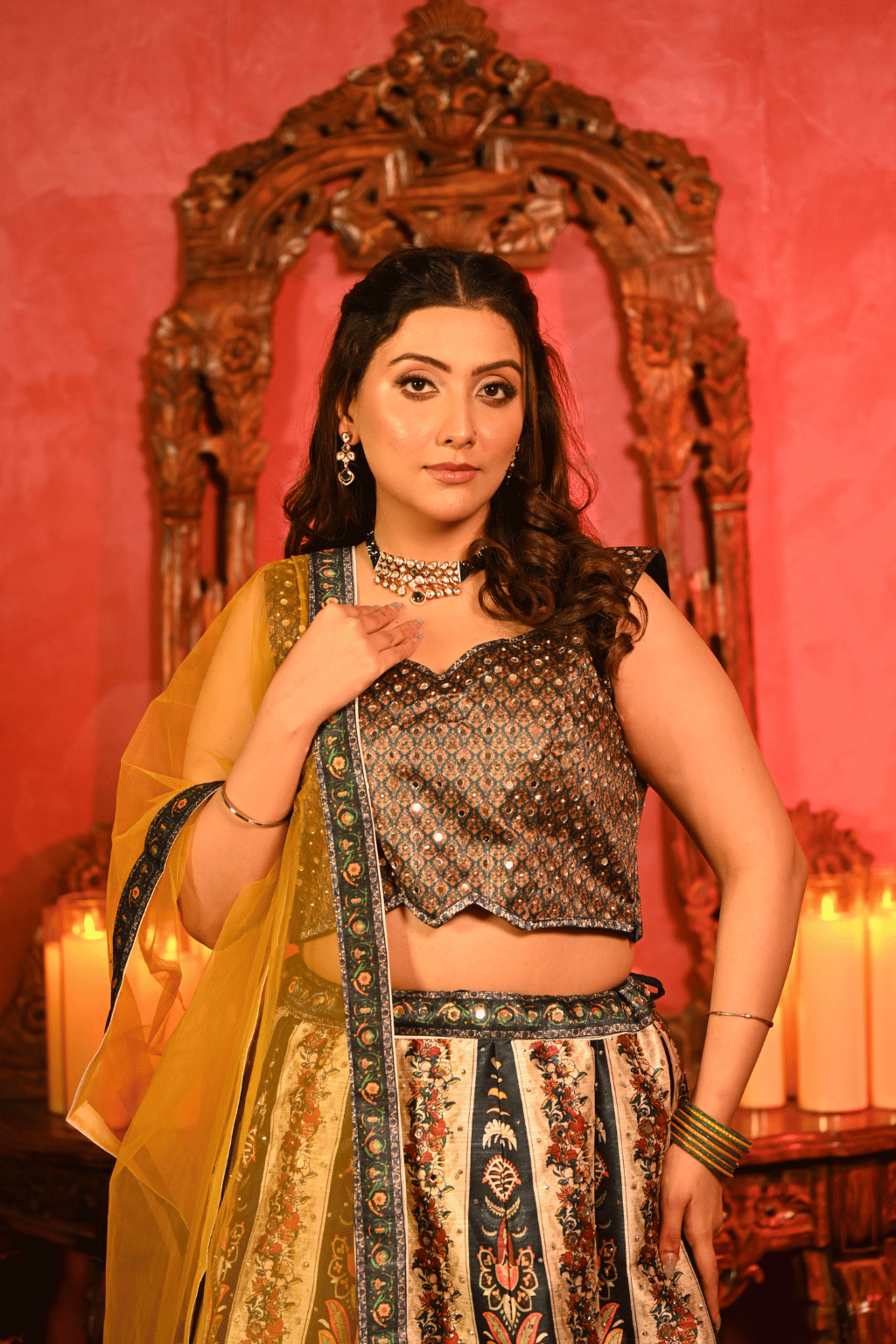 | A regal blend of tradition and trend, midnight gold lehenga rings together heritage prints, subtle shimmer and a modern silhouette. The lehenga features royal Mughal-inspired motifs in deep jewel tones, finished with delicate mirror highlights and zari accents — giving it the perfect festive glow.