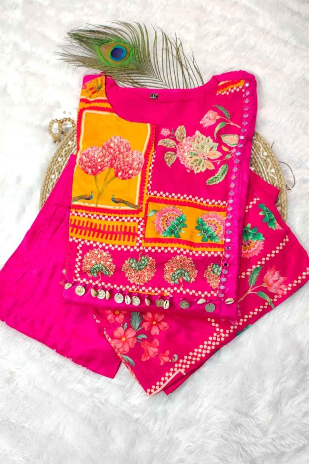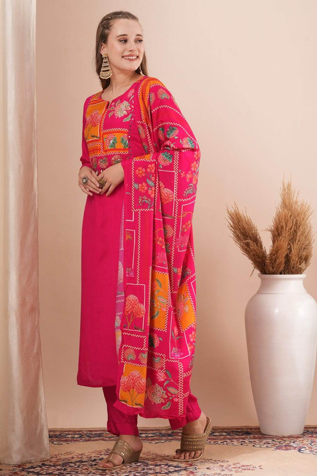 Elevate your ethnic wardrobe with this vibrant pink kurta set featuring ethnic motif prints and exquisite bead and stone detailing. The straight-fit shantoon kurta is paired with solid trousers and a beautifully printed silk blend dupatta. Perfect for festive and casual occasions, this three-piece ensemble combines tradition with modern charm.