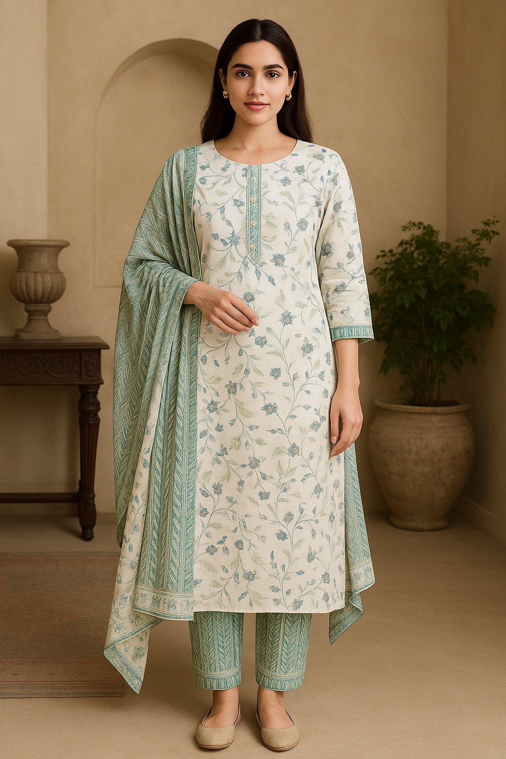 Experience effortless elegance with this Pure Malmal Cotton Suit, thoughtfully crafted for women who value comfort without compromising on style. The ivory kurta is adorned with refreshing blue-green floral prints in a hand-block style, paired with breathable pants and a soft printed dupatta.