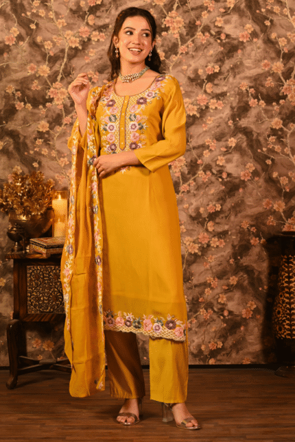 Shripali Mustard Chinon Silk Bandhej Suit With Heavy Zari And Thread Embroidery