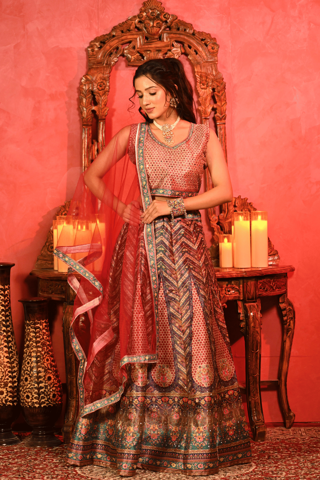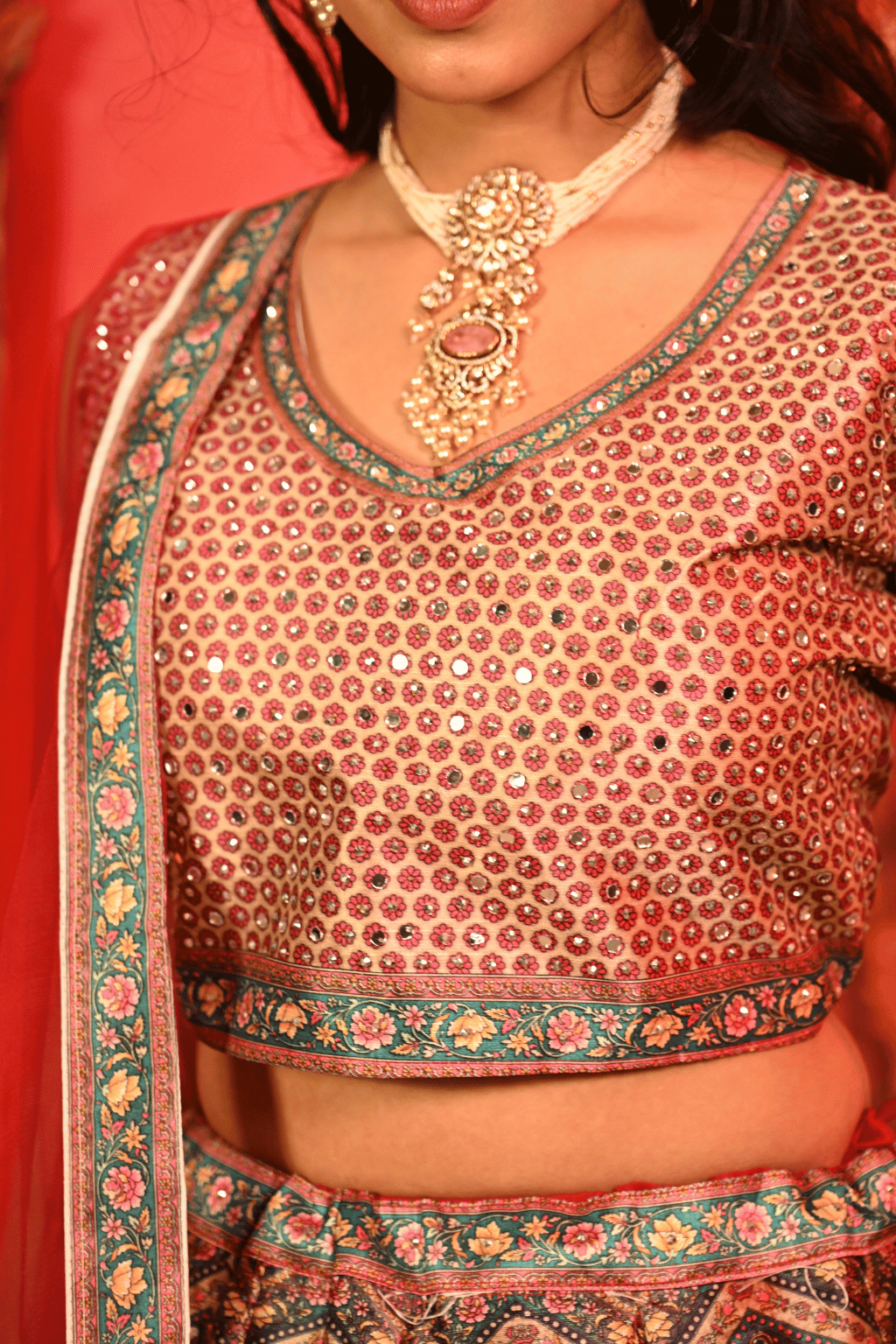 The blouse is beautifully crafted with a V-shaped neckline and a sleeveless designer cut, accentuated by intricate hand mirror work and fine zari threads. The flared lehenga showcases a stunning printed base in rose tones, enhanced with a subtle sheen that feels both luxurious and lightweight. A contrasting organza dupatta completes the ensemble, adding a dreamy balance of texture and elegance. Designed for sangeet soirées, haldi brunches, mehendi afternoons, or destination weddings, this look redefines festive luxury with Shripali’s signature touch of grace. |